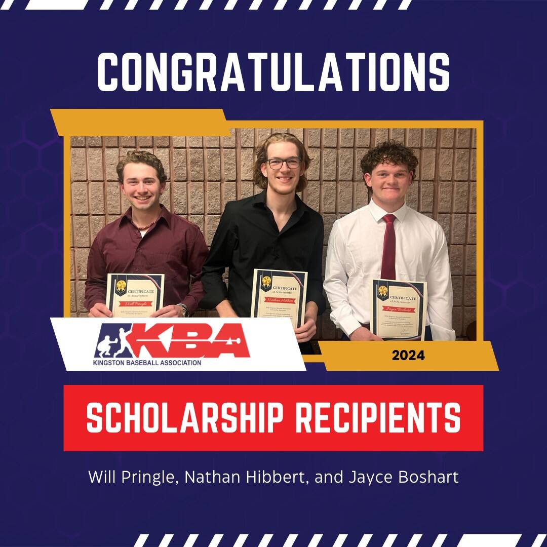 Each year, the Kingston Baseball Association wishes to support players in their pursuit of post-secondary education by granting scholarships to eligible Kingston Baseball Association Alumni. Up to 2 scholarships will be awarded in recognition of outstanding commitment to community service, athletics, and academic excellence. These scholarships aim to acknowledge those achievements of our young baseball players while assisting with the high costs associated with continuing their post-secondary